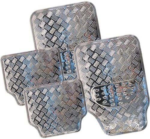 Set of 4 mats for full coverage restyle your vehicle with new metallic diamond plate mats. Durable vinyl with anti colour-fade scratch resistant finish. Protects original carpet against spills, stains, mud and debris