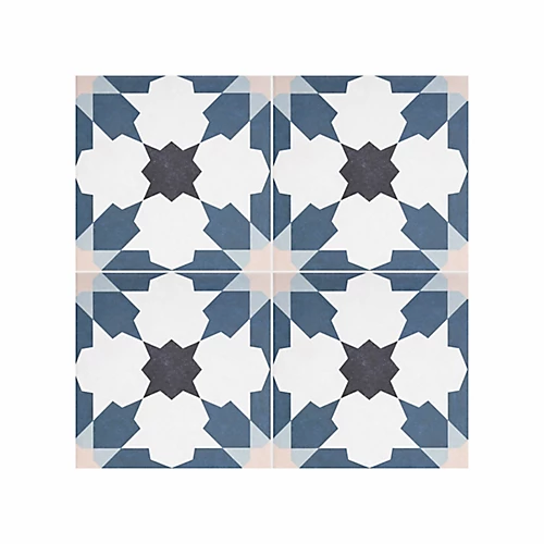 - Bouquet is a geometric floral patterned tile in indigo blue, white and grey tones. This 45 x 45cm tile is made from porcelain, providing the durability and resistance to be used indoors or out, on the wall or floors. The encaustic effect, provides a matt finish. Each tile features pre-scored lines which creates the effect of four smaller tiles once grouted, but makes installation easier.