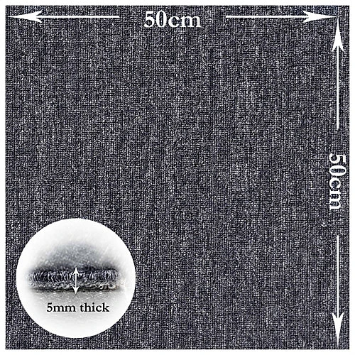 This offer is for 5 square metres (54 square feet) high quality, heavy duty contract carpet tiles in Dark Grey with bitumen backing. Each tile is 50cm x 50cm and packed 20 tiles per carton (5 square metres). The carpet tiles are easy to use and can be laid as permanent flooring or temporary, there is no need for underlay if you have a suitable flat surface. Any spills or damage simply lift and replace.Â