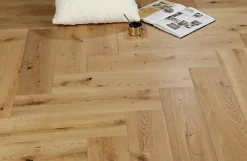 Impero Summer Oak Herringbone exudes delicate tones of light brown with earthy hues in the knots and grains that truly transform this engineered wood into a masterpiece of interior design. The classic herringbone style will create a striking look and is sure to become a conversational piece with your guests. The planks measure 14 in thickness and come with a durable 3 hardwood layer, offering a convenient alternative to a solid wood product. The surface boasts a brushed and UV oiled finish which protects the floor while also allowing the beauty of the authentic wood detailing to shine through. Designed to be installed in a classic herringbone pattern with a simple click fitting system, this engineered wood floor will complement a traditional decor perfectly and will bring classic style into modern interiors.