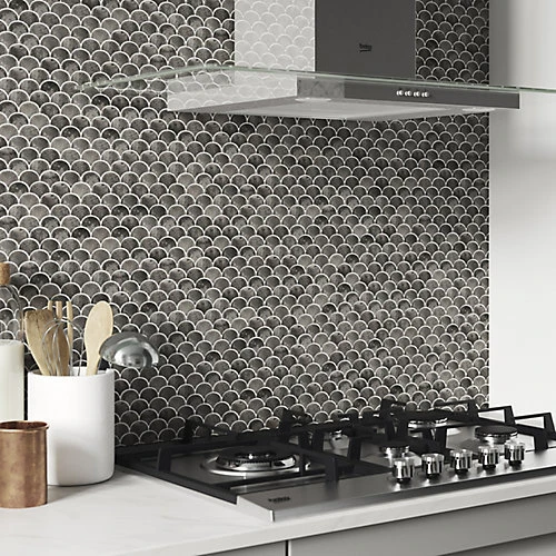 - Transform your home interior with the Kiwana ceramic mosaic. The distinctive shape of this tile is influenced by Moroccan design. The playful mini fish scallop shape is eye-catching and finished with a contemporary concrete effect.