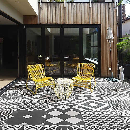 - With the striking black and white pattern on this large format tile, you can create an outdoor feature floor with a perfect mix of style and functionality.